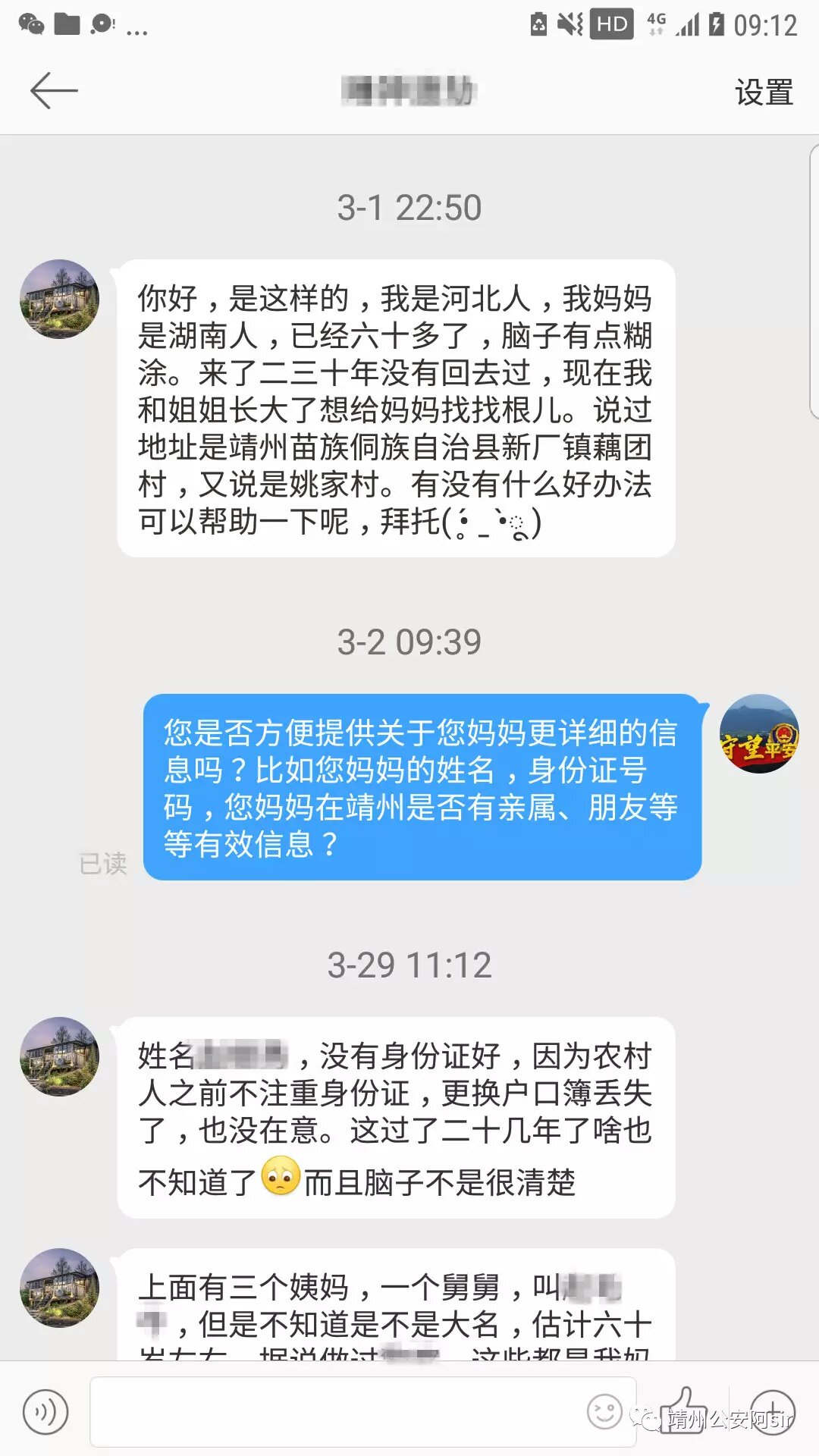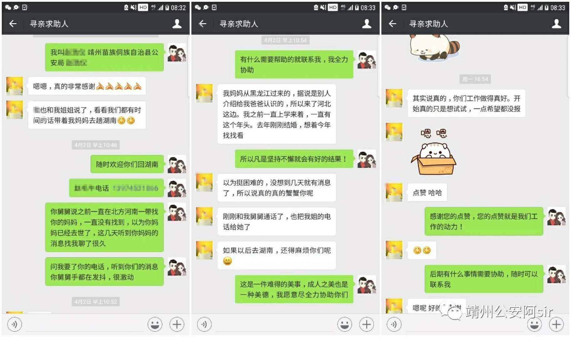 机缘巧合之下,小路刷微博时看到了“靖州警务”,抱着试试看的心态写了一条微博留言。小编在看到留言后,马上回复了小路,通过一段时间的交流和联系,小编加上了求助人小路的微信,不断的了解小路妈妈的相关情况,分析寻找有效线索,通过小路提供的相关线索,小编四处联系,成功帮助小路找到了她的亲舅舅赵叔叔。于是便有了开头暖心的那一幕亲人视频相认的照片。