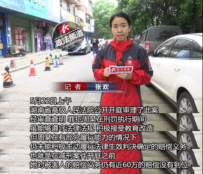 由于周某做案时怀有身孕,待她将小孩生下来后, 2014年,长沙市人民检察院以故意伤害罪对周某提起公诉。周某被判处无期徒刑,剥夺政治权利终身。此外,案发后,开福区人民法院曾对这起案件的民事部分进行开庭审理,法院依法判处周某赔偿小玉及其家人149万余元。在湖南省女子监狱服刑三年后,周某申请减刑。执行机关以周某在刑罚执行期间确有悔改表现为由,报请省高院将其无期徒刑的刑罚减为有期徒刑二十二年,剥夺政治权利终身改为剥夺政治权利十年。