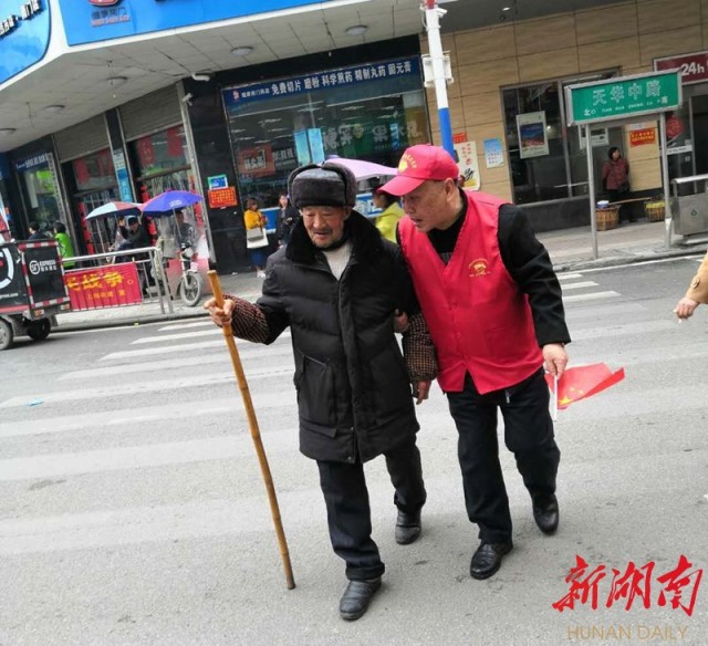 11时30分,是该社区的交通高峰期。廖祥云和60岁的奉雪歌一起去附近马路的人行道上疏导交通。有位老人要过马路,奉雪歌搀扶着老人慢慢通过后又回到原处继续指挥。