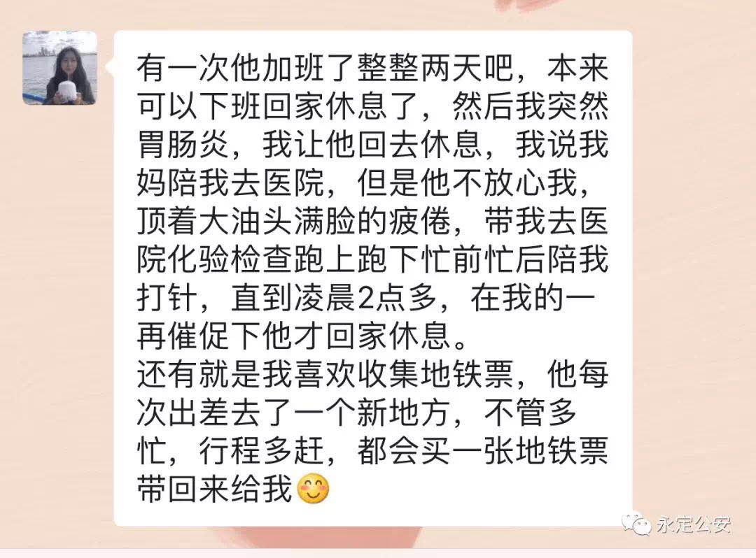 在抓捕嫌疑人时,在深夜伏案整理卷宗忙得连饭都顾不上吃时,在看到你拖着疲惫的身体,满脸胡渣憔悴样子的时候,有时候想着想着就忍不住流泪,我只想过简简单单平静朴实的生活,只想你能陪伴我细水长流,一起白头。但是我知道,与你牵手,我便嫁给了警察这份职业,这份事业,这份责任。