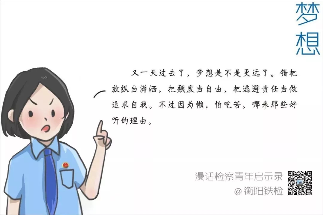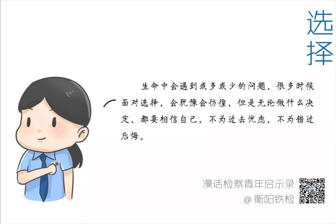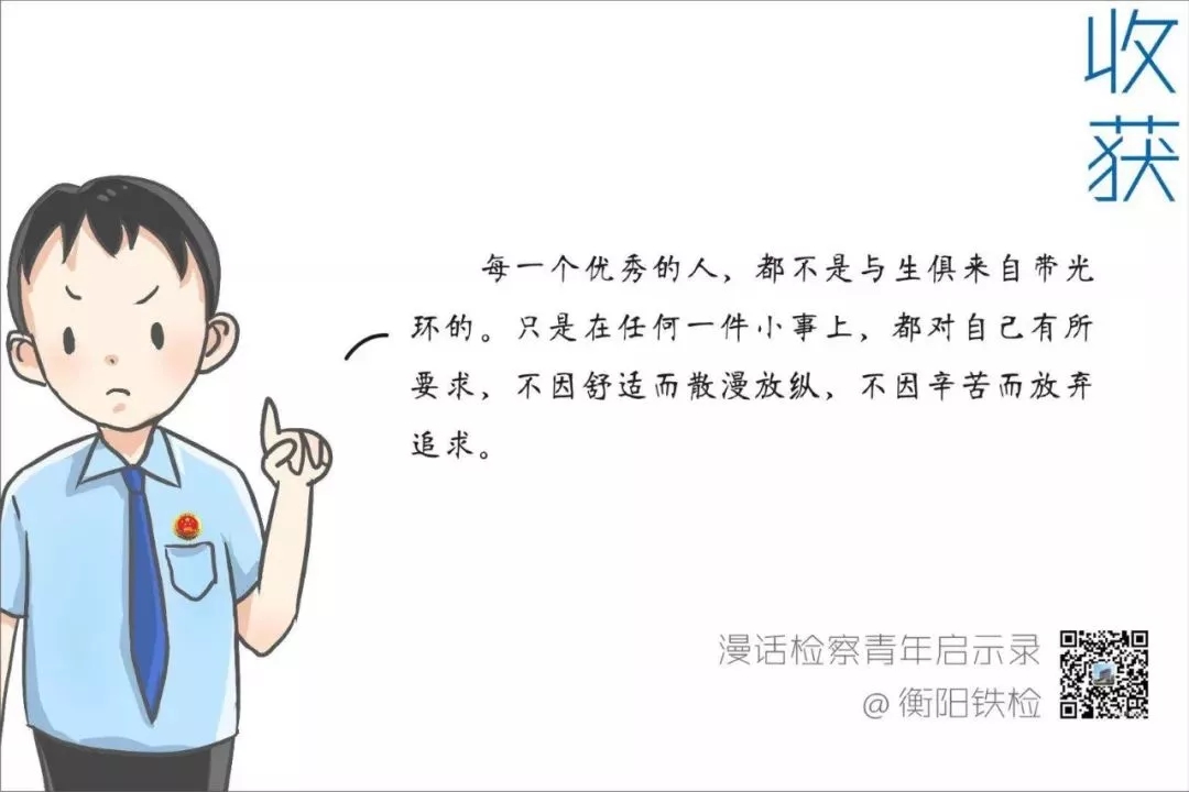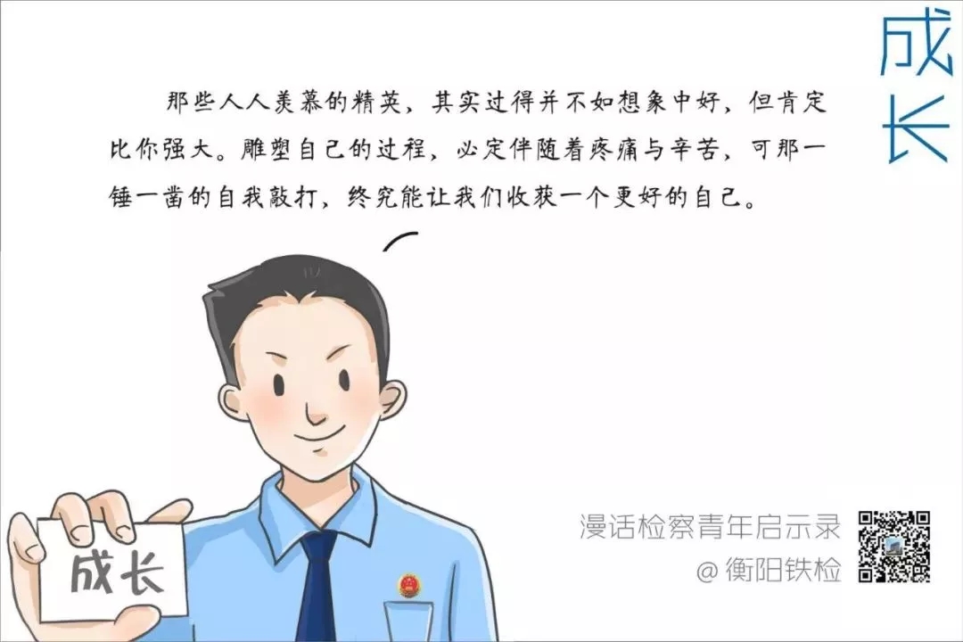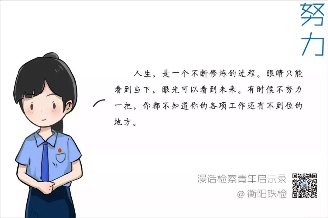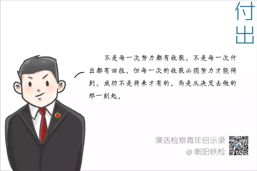 文章来源:衡阳铁路运输检察院 作者: 时间:2019-04-30 15:06:51希望这些话语和句子,能像种子,像一阵风,哪怕只是无意间播洒在你的心里。在许许多多个不眠的夜晚,早起的清晨,一次次在内心的深处,坚定对检察工作的信仰和对自己的信心。这些年,让你坚持下来的,难以忘怀的,也许只是一些微小的瞬间,跟着漫话检察青年启示录一起浏览,在检察职业生涯中闪闪发光的青春记忆。