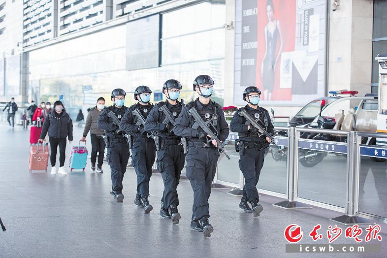 2月5日早上6时,长沙火车南站,乘客极少,但长沙市公安局特巡警支队第五特警大队民警粟玮已到达“星城快警”平台,开始了一天的执勤工作。除微型冲锋枪、手枪等警用装备,口罩、消毒液等“装备”也不可少。在各警种的联勤联动机制下,粟玮和另外两名同事的值守重点在站区东广场,他们随时准备应对站内治安问题和站外突发状况。