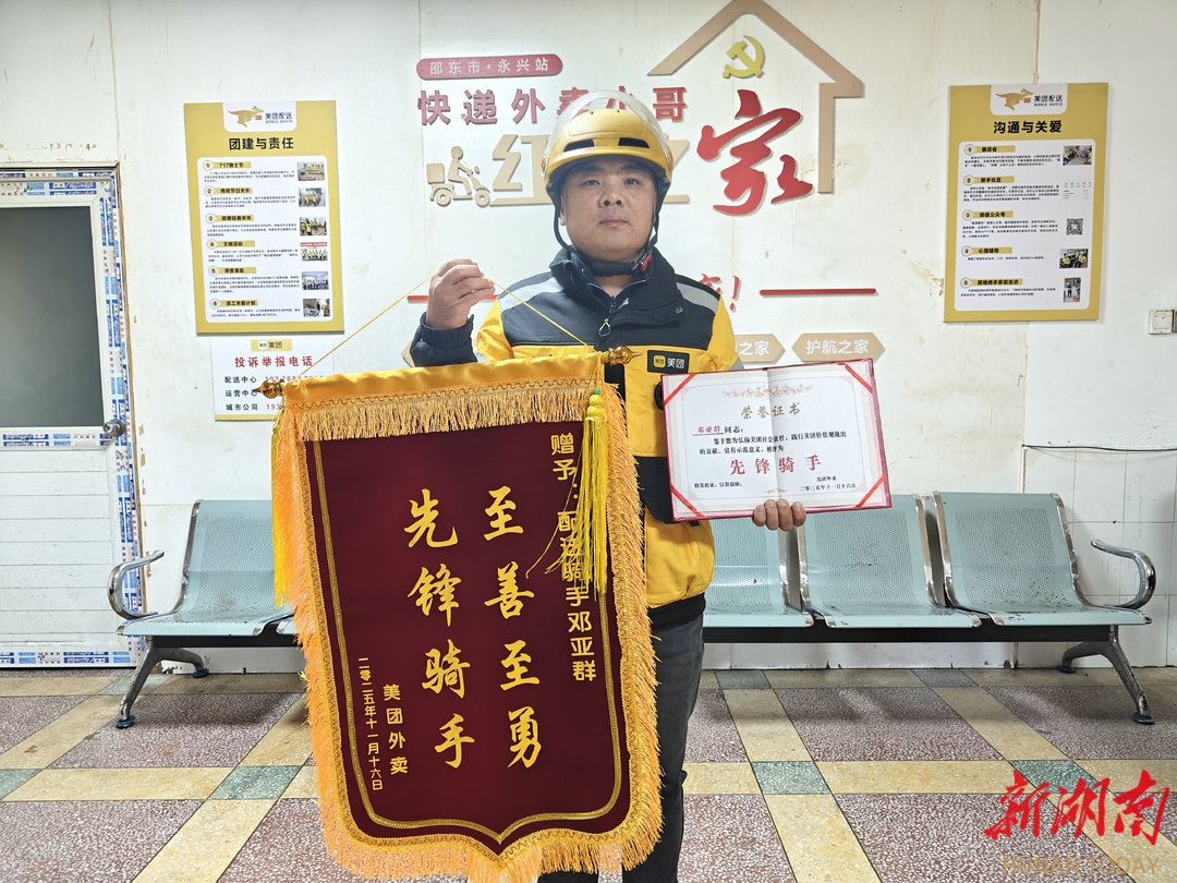 邓亚群的义举很快传遍了邵东大地,身边的同事们并不意外。在美团邵东永兴站,他是大家公认的“模范骑手”。“老邓平时工作特别认真,为人和气,总比别人多跑几单,却从不抱怨。”带邓亚群入行的站长杨县由衷地为他骄傲,“为他点赞,以后要多向他学习。”