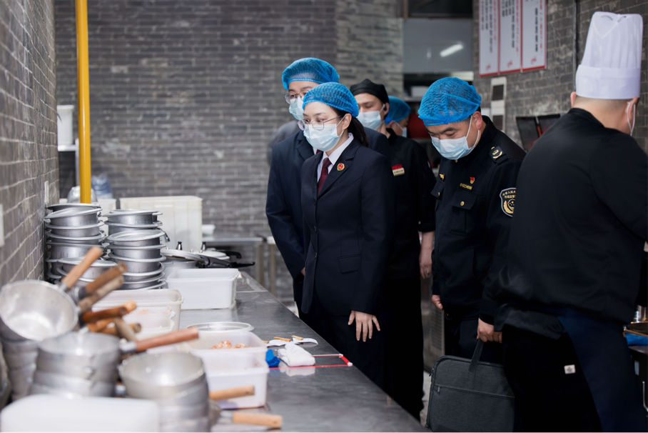 图为检察干警与执法人员核查商户后厨食品安全问题。