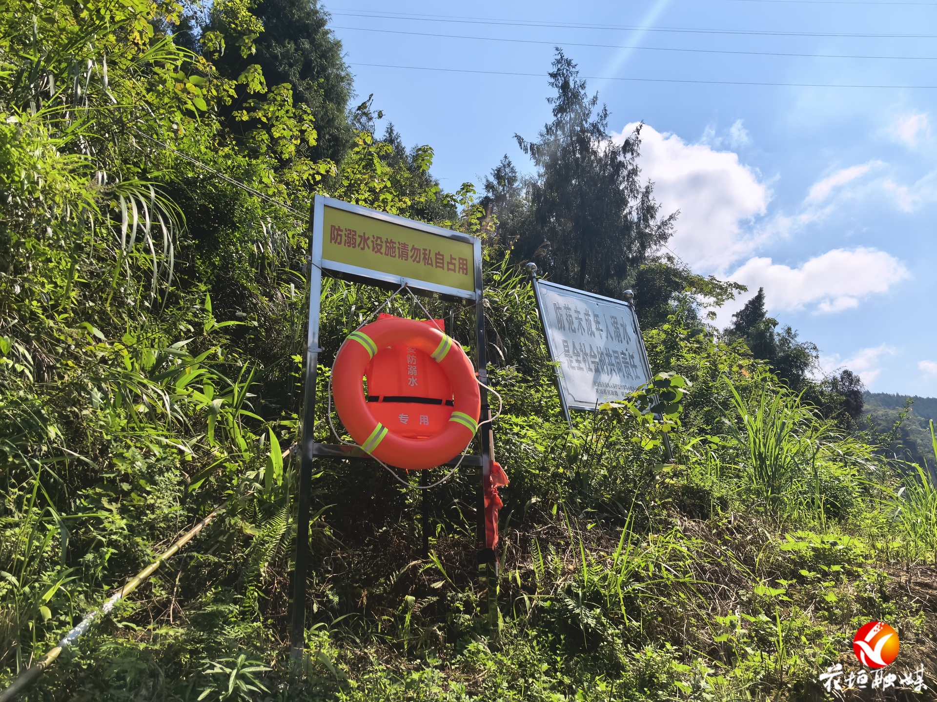 岸边的警示标语及救援物资